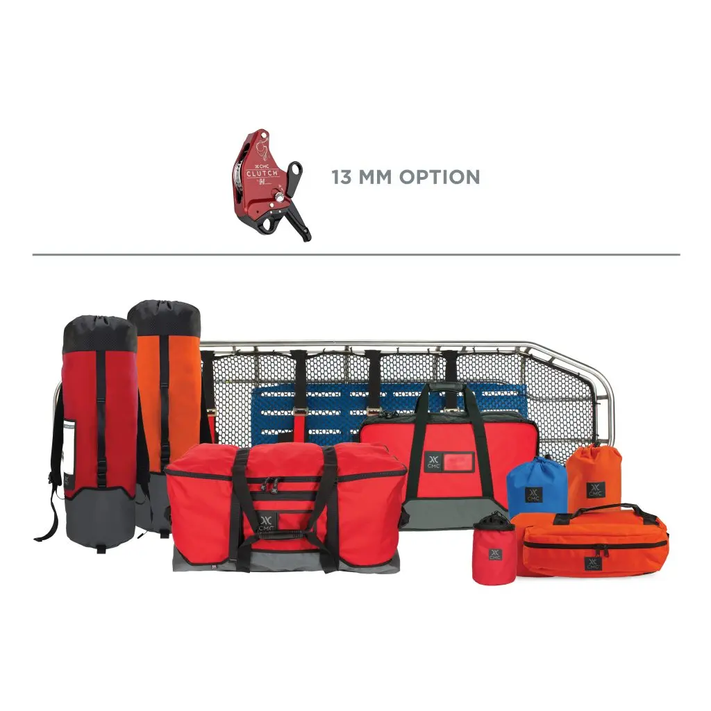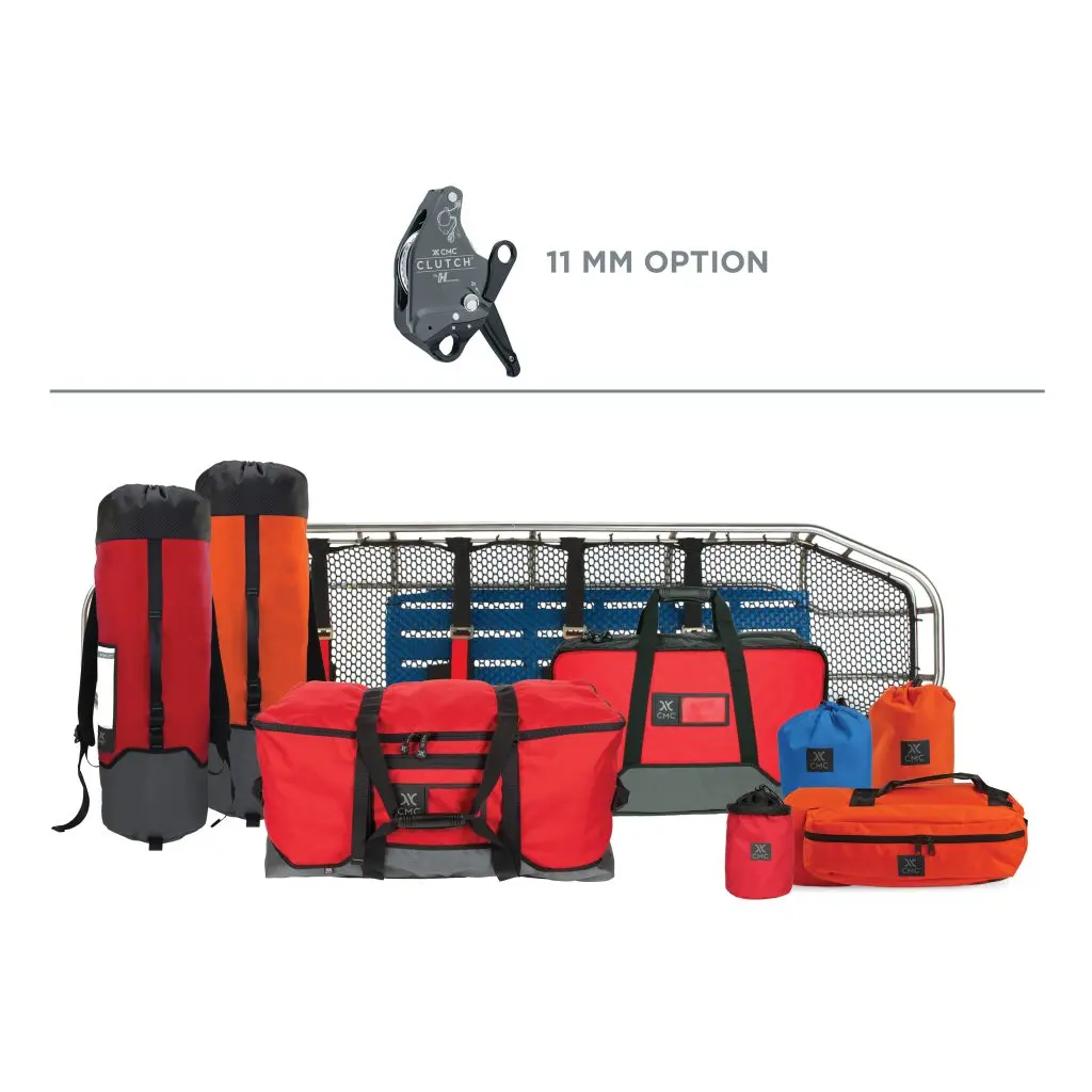 Two options of this kit are available based on the desired rope size. The 11 mm (7/16 in) Rope Rescue Rigging Kit includes all the items below plus two 11 mm CLUTCH units and two 200 ft lengths of 11 mm G11™ rope. The 13 mm Rope Rescue Rigging Kit includes all the items below plus two 13 mm CLUTCH units and two 200 ft lengths of 12.5 mm Static-Pro™ rope. In addition to the equipment provided in this Rope Rescue Rigging Kit, CMC recommends outfitting each team member with the gear in the Technical Rope Rescuer Personal Kit.