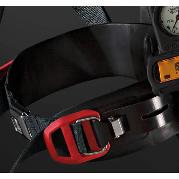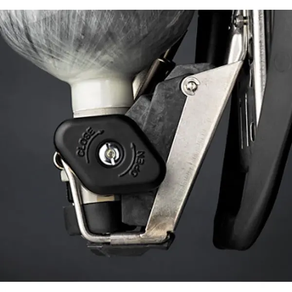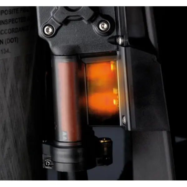 Blinking lights are positioned around the SCBA for good visibility even in bad conditions. The lights change color indicating PASS status and air pressure.