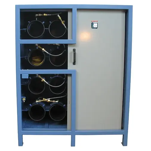 This containment cabinet encloses both the cylinders and the filling hoses with a ½” plate steel sliding front access door for ease of access and operator safety. The frame is designed to contain an SCBA/SCUBA cylinder failure or ruptured fill hose. The door must be closed and locked before cylinders can be recharged, a toggle activated valve automatically stops air flow to the filling points as soon as the door is opened. Heavy wall schedule 80 steel 8” pipe is used to contain the SCBA cylinders within the recharge station, 10” is also available for SCUBA filling.