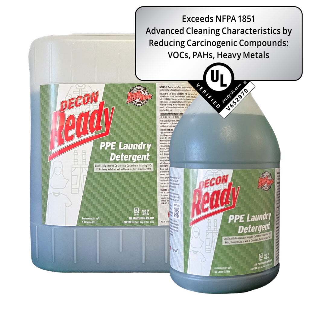 Decon Ready™ PPE Laundry Detergent washes and protects clothing and turnout gear by following NFPA 1851:2020, making it easier than ever to ensure your protective gear lasts longer! Decon Ready™ PPE Laundry Detergent can pull out dirt, toxic chemicals, metal oxides, plastic residue, soot, drug residue, and cationic nuclear isotopes from turnouts without including harmful chemicals such as D-limonene. In addition, this detergent doesn’t contain any citrus-based solvents! In short, Decon Ready™ PPE Laundry Detergent keeps your gear clean without destroying it in the process!