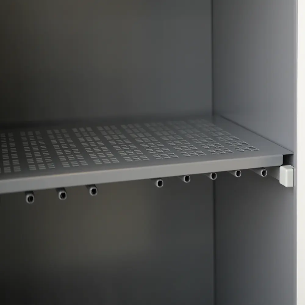 - Included accessories: hanging rod, two Dry Kwik coat hangers, three tiers of retractable hanging racks, two ventilated shelves, door hook rack (13 hooks), and two door bars