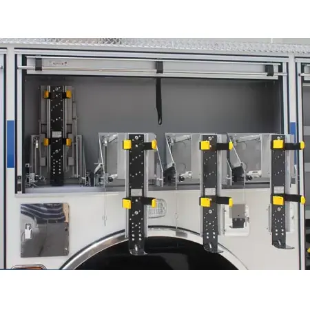 Ideal for quick access, the Ziamatic™ QUIC-SWING SCBA Bracket is a sturdy, reliable mounting solution designed to securely hold and easily release SCBA packs in emergency vehicles.